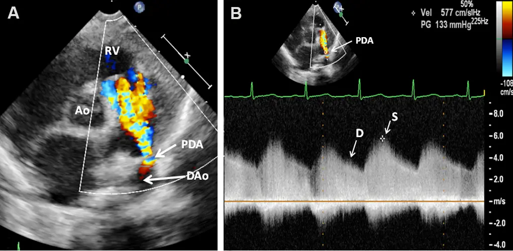 In (A) you see flow going from the proximal descending aorta through the PDA into the proximal left pulmonary artery. In (B) we see spectral doppler showing continuous flow with higher velocities in systole than in diastole.