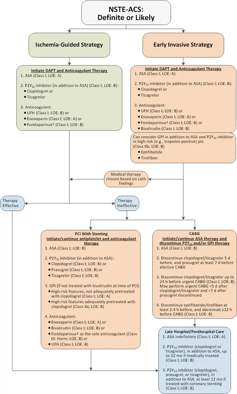 Amsterdam EA, Wenger NK, Brindis RG, Casey DE Jr, Ganiats TG, Holmes DR Jr, Jaffe AS, Jneid H, Kelly RF, Kontos MC, Levine GN, Liebson PR, Mukherjee D, Peterson ED, Sabatine MS, Smalling RW, Zieman SJ. 2014 AHA/ACC Guideline for the Management of Patients with Non-ST-Elevation Acute Coronary Syndromes: a report of the American College of Cardiology/American Heart Association Task Force on Practice Guidelines. J Am Coll Cardiol. 2014 Dec 23;64(24):e139-e228. doi: 10.1016/j.jacc.2014.09.017. Epub 2014 Sep 23. Erratum in: J Am Coll Cardiol. 2014 Dec 23;64(24):2713-4. PMID: 25260718. ↩ ↩2