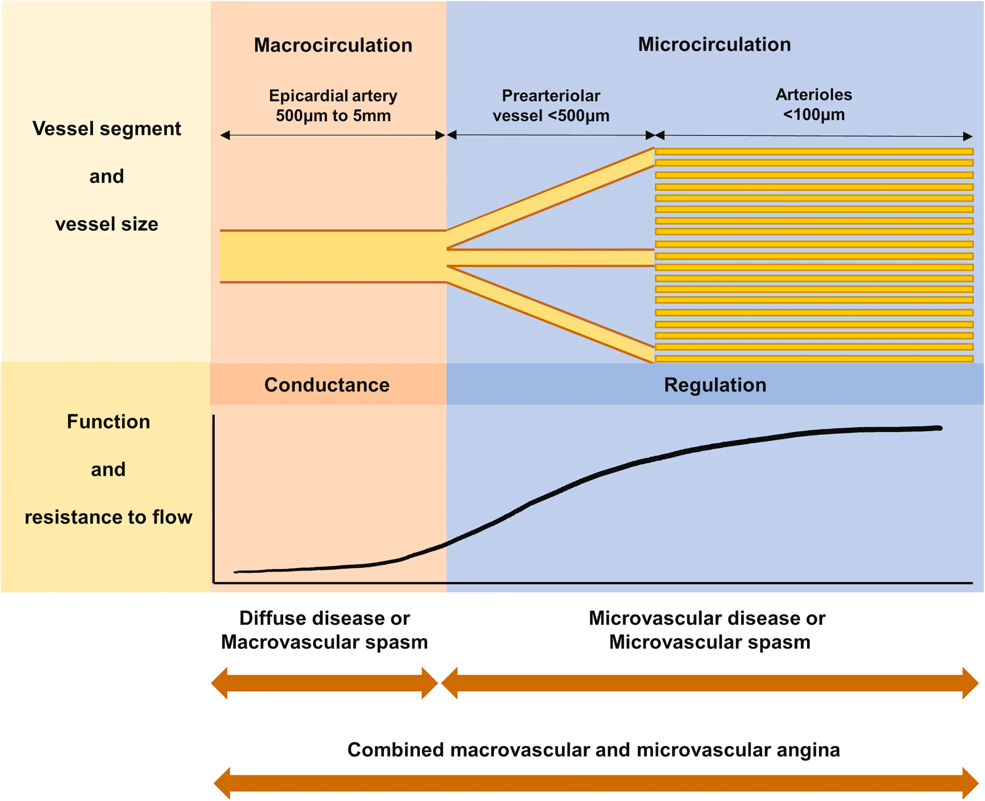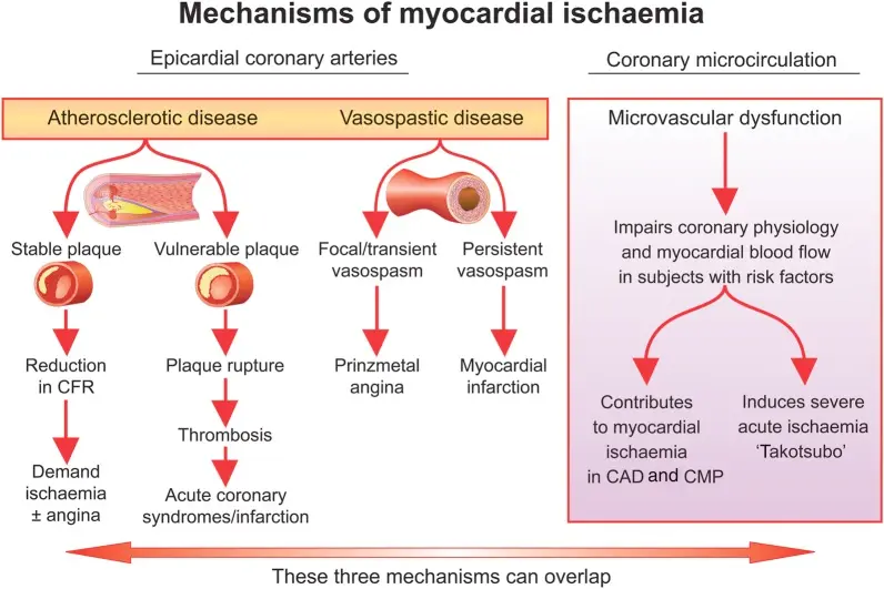 Figure source: 2 - In addition to the ‘classic mechanisms’ (i.e. atherosclerotic disease and vasospastic disease) that lead to myocardial ischaemia, coronary microvascular dysfunction (CMD) has recently emerged as a ‘third’ potential mechanism of myocardial ischaemia. As in the case of the other two mechanisms, coronary microvascular dysfunction (alone or in combination with the other two) can lead to transient myocardial ischaemia as in patients with coronary artery disease (CAD) or cardiomyopathy (CMP) or to severe acute ischaemia as observed in Takotsubo syndrome. CFR, coronary flow reserve.