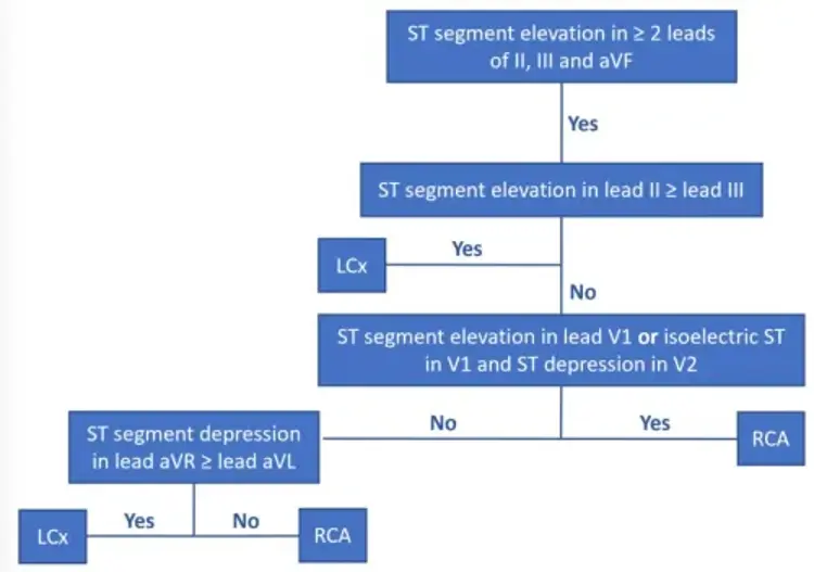 flowchart TD A[Inferior STEMI] --> B(STE in III > II) B --> D(STE in V1?) D -->|STE| E[Proximal RCA<br>RV infarct] D -->|No STE| F(STE in V4R?) F --> |STE| G[Proximal RCA<br>RV infarct] F --> |No STE| H[Mid RCA] A --> C(STE in II > III) C --> Z[LCx or Distal RCA]