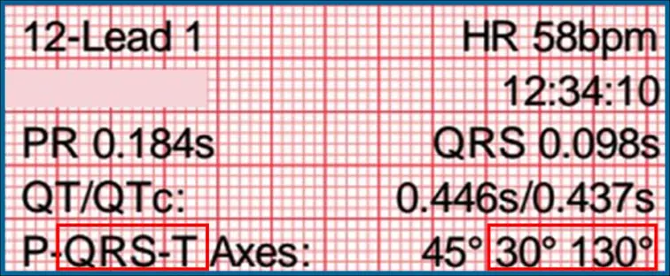 - The QRS-T angle (difference between the QRS axis and T axis) is 100 degrees! Whenever the QRS/T angle is ≥ 100 degrees you should stop and think because there’s an excellent chance it’s not a STEMI!