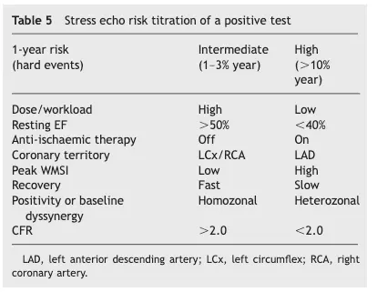 Table source: 📄 Sicari, R., Nihoyannopoulos, P., Evangelista, A., Kasprzak, J., Lancellotti, P., Poldermans, D., Voigt, J.-U., & Zamorano, J. L. (2008). Stress echocardiography expert consensus statement: European Association of Echocardiography (EAE) (a registered branch of the ESC). European Journal of Echocardiography, 9(4), 415–437. https://doi.org/10.1093/ejechocard/jen175