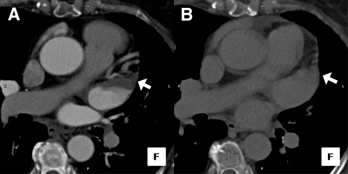 Figure source: 2 - Axial image of a Cardiac CT Study Performed in a Patient Before RF Pulmonary Vein Ablation: (A) Initial image obtained after contrast injection demonstrates filling defect in the left atrial appendage tip. (B) Delayed image obtained 1 min after initial scan shows homogeneous opacification, suggesting an absence of thrombus.