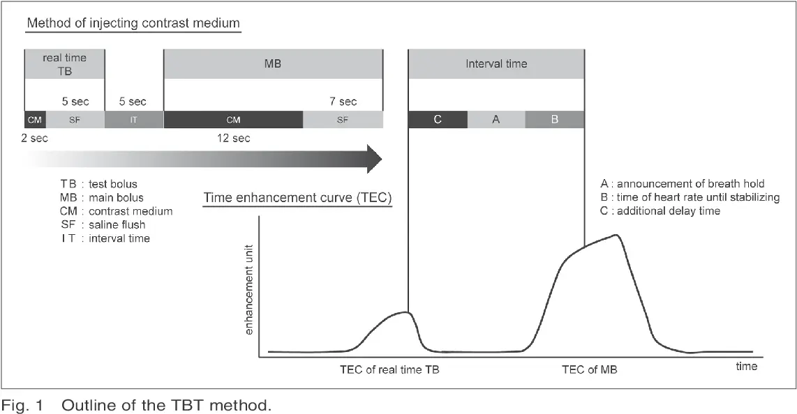 - Test bolus - determine bolus timing, i.e. see when it is at its peak → use this timing for the “real” scan