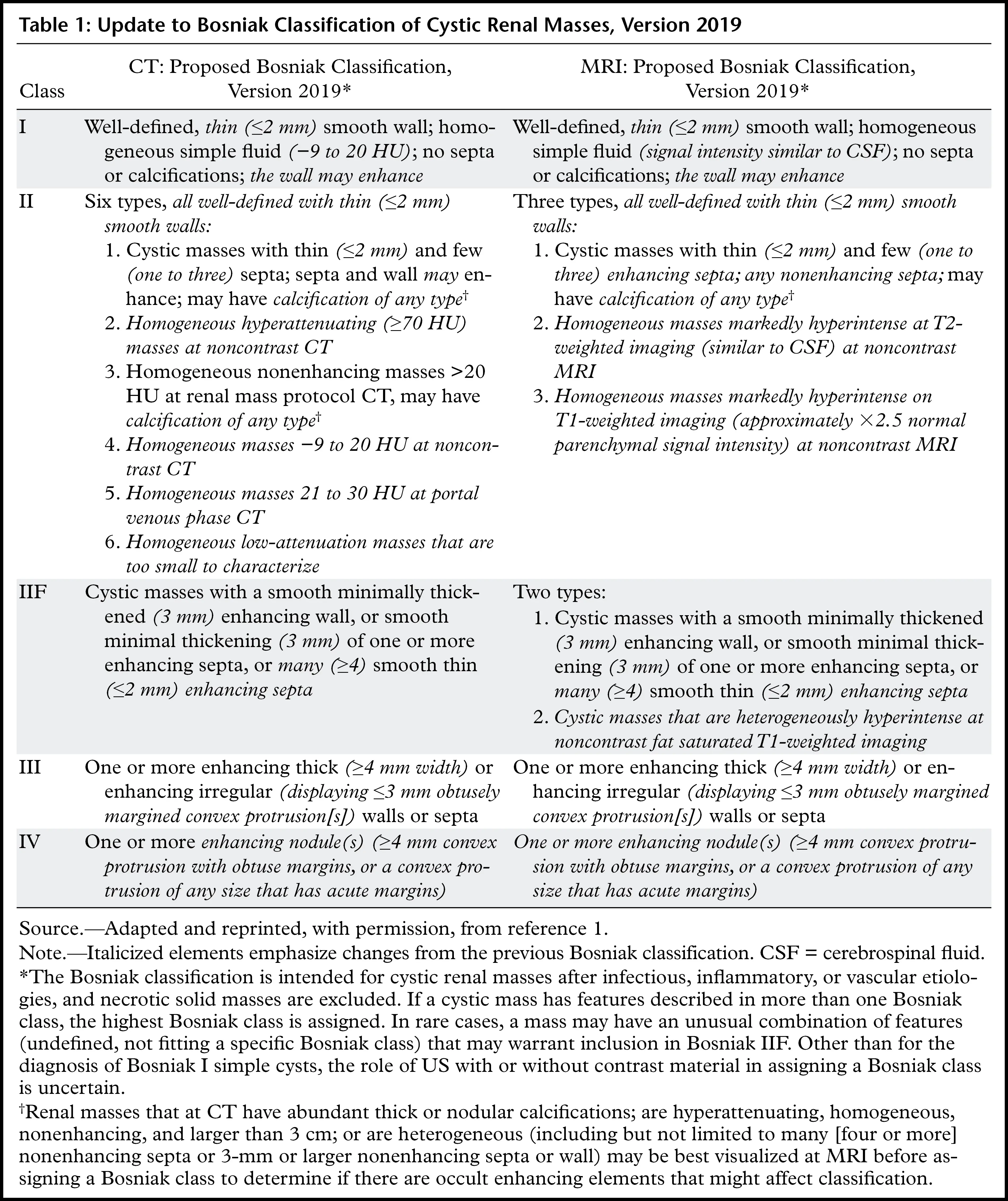 Schieda N, Davenport MS, Krishna S, Edney EA, Pedrosa I, Hindman N, Baroni RH, Curci NE, Shinagare A, Silverman SG. Bosniak Classification of Cystic Renal Masses, Version 2019: A Pictorial Guide to Clinical Use. Radiographics. 2021 May-Jun;41(3):814-828. doi: 10.1148/rg.2021200160. Epub 2021 Apr 16. Erratum in: Radiographics. 2022 Jan-Feb;42(1):E33. doi: 10.1148/rg.219016. PMID: 33861647. ↩ ↩2
