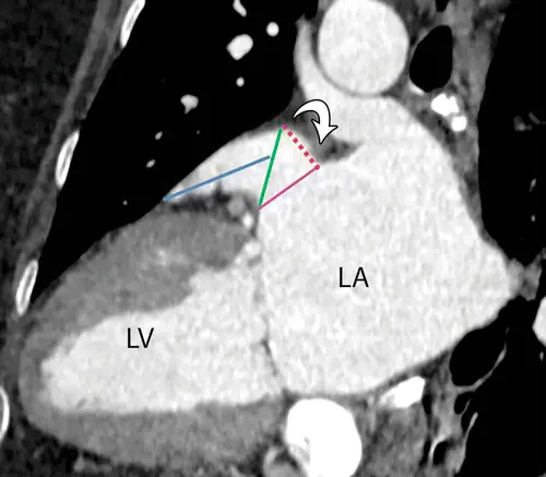 CT provides accurate measurements of the LAA ostial diameter, landing zone diameter, and LAA length, which are vital for accurate sizing of the device. CT allows evaluation of the relationship with the pulmonary veins and other adjacent structures that can be injured during the procedure. CT also simulates procedural fluoroscopic angles and provides evaluation of the interatrial septum, which is punctured during LAA closure. (Source)
