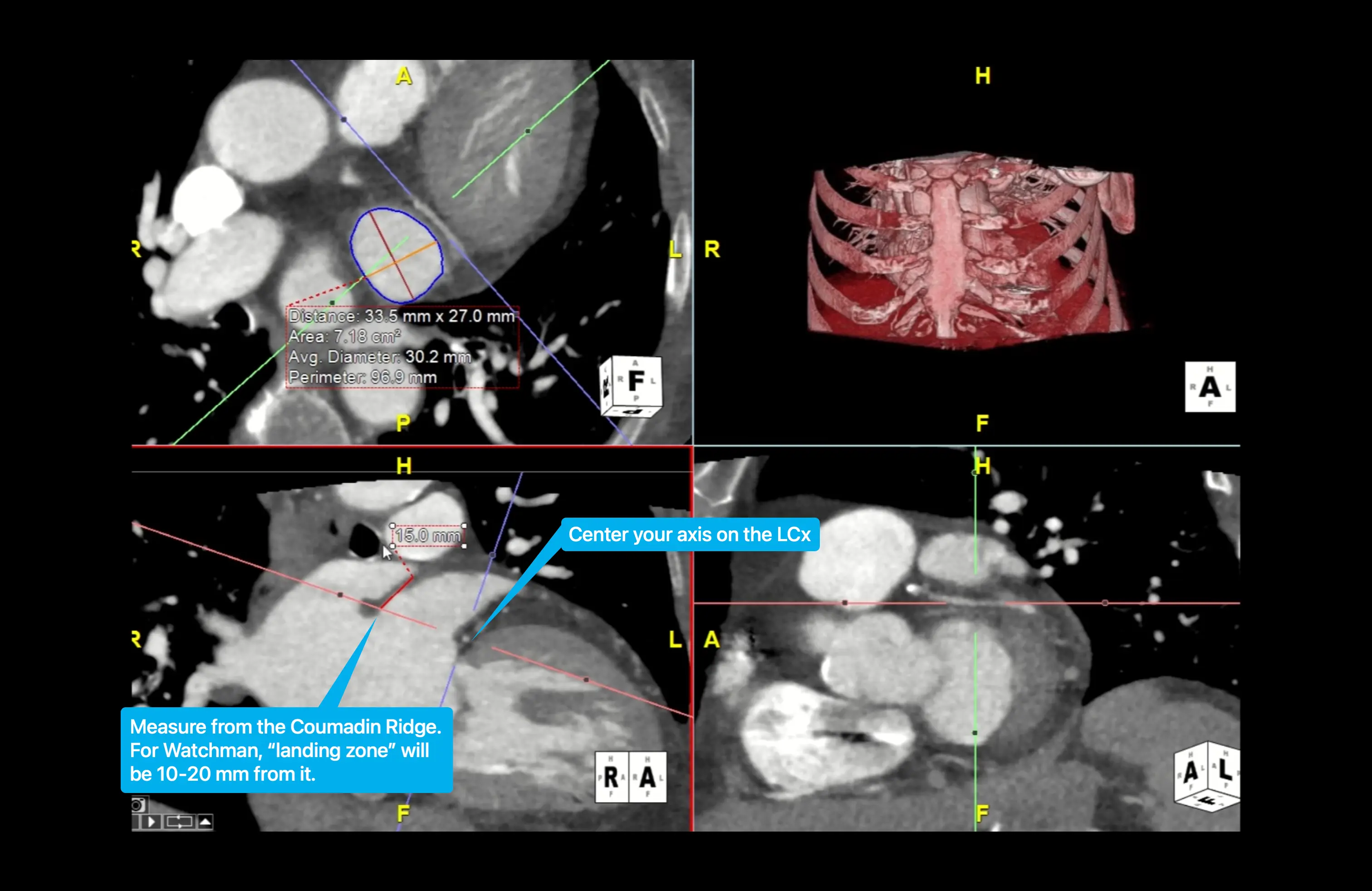 At CT, the landing zone is identified on the long-axis LAA view. For the Watchman device, the landing zone is located 10–20 mm inside the LAA from the Coumadin ridge (aka limbus). The landing zone diameters for the Watchman device are measured on an en-face-view CT image obtained at a line that connects the LAA adjacent to the left circumflex artery to the point 10–20 mm inward of the Coumadin ridge. 1