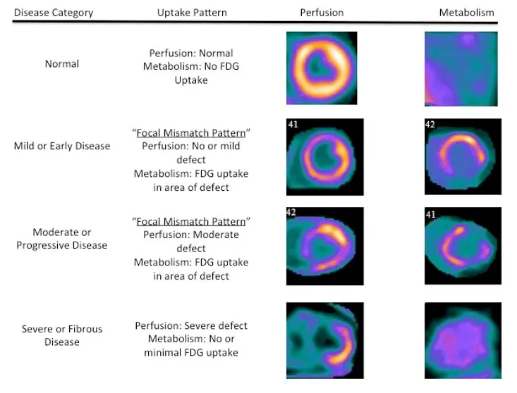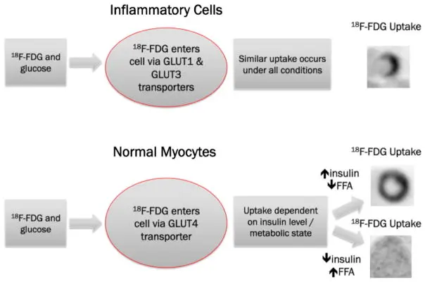 - b/c ischemic cells with take up FDG, which can be misleading. Ischemia induces translocation of GLUT4 to cell membrane