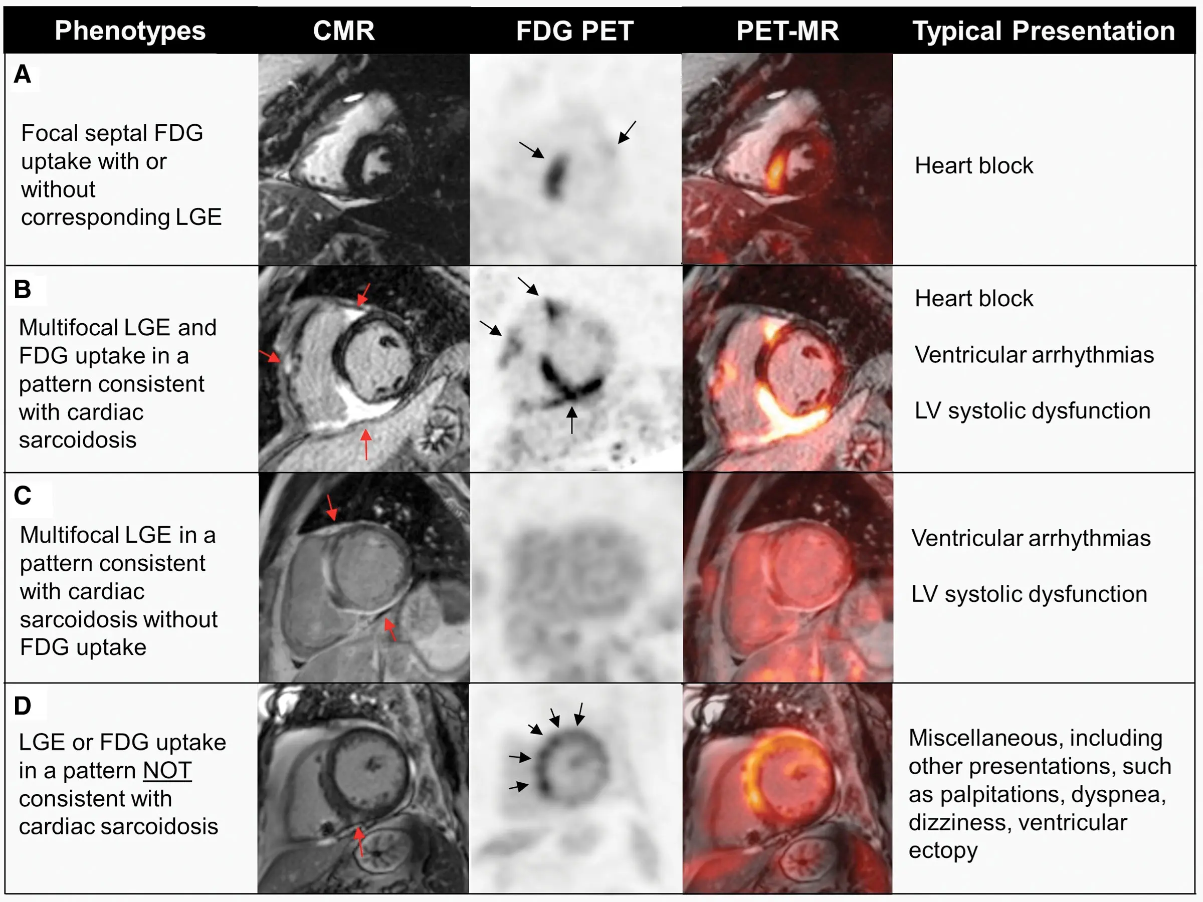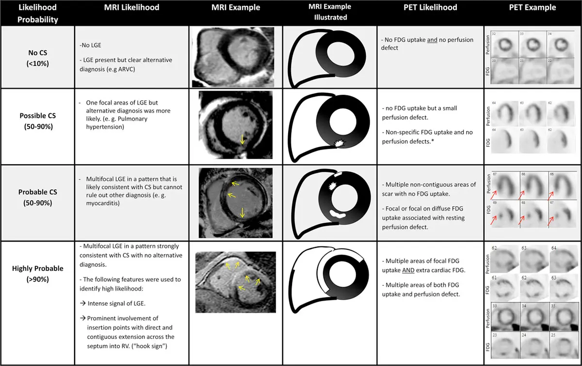 - Typical pattern: multifocal multi-pattern LGE with septal and RV involvement. More specific but no pattern is 100% specific.