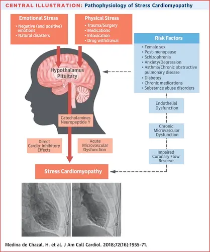 - The typical patient with stress cardiomyopathy is a postmenopausal woman who has experienced severe, unexpected emotional stress in the prior 1 to 5 days. This is often superimposed on a background of elevated levels of stress or anxiety, or an anxiety or panic disorder, but it may also be unheralded.