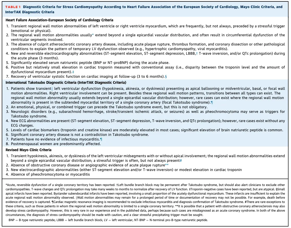 Medina de Chazal, H., Del Buono, M. G., Keyser-Marcus, L., Ma, L., Moeller, F. G., Berrocal, D., & Abbate, A. (2018). Stress Cardiomyopathy Diagnosis and Treatment. Journal of the American College of Cardiology, 72(16), 1955–1971. https://doi.org/10.1016/j.jacc.2018.07.072 ↩