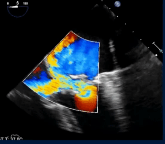 - The following TEE with color Doppler shows a jet of MR going into the LA and RA