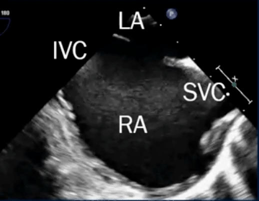 - TEE below shows bicaval view. To identify the superior sinus venosus defect (i.e. SVC type), you’ll want to pay attention to the SVC area as highlighted in this image.