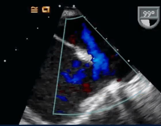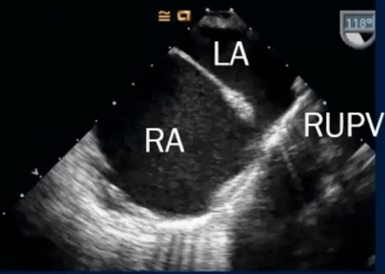 - On Color Doppler, we see the blue flow going from LA to the RA through the superior sinus venosus defect: