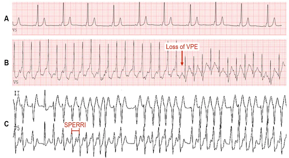 1A: Typical WPW preexcitation pattern manifesting as a short PR interval, delta wave, and wide QRS complex. 1B: Loss of ventricular preexcitation (VPE) during noninvasive testing.1C: Noninvasive shortest preexcited R-R interval (SPERRI) measurement during rapid preexcited AF that can potentially precipitate ventricular fibrillation. (Source)