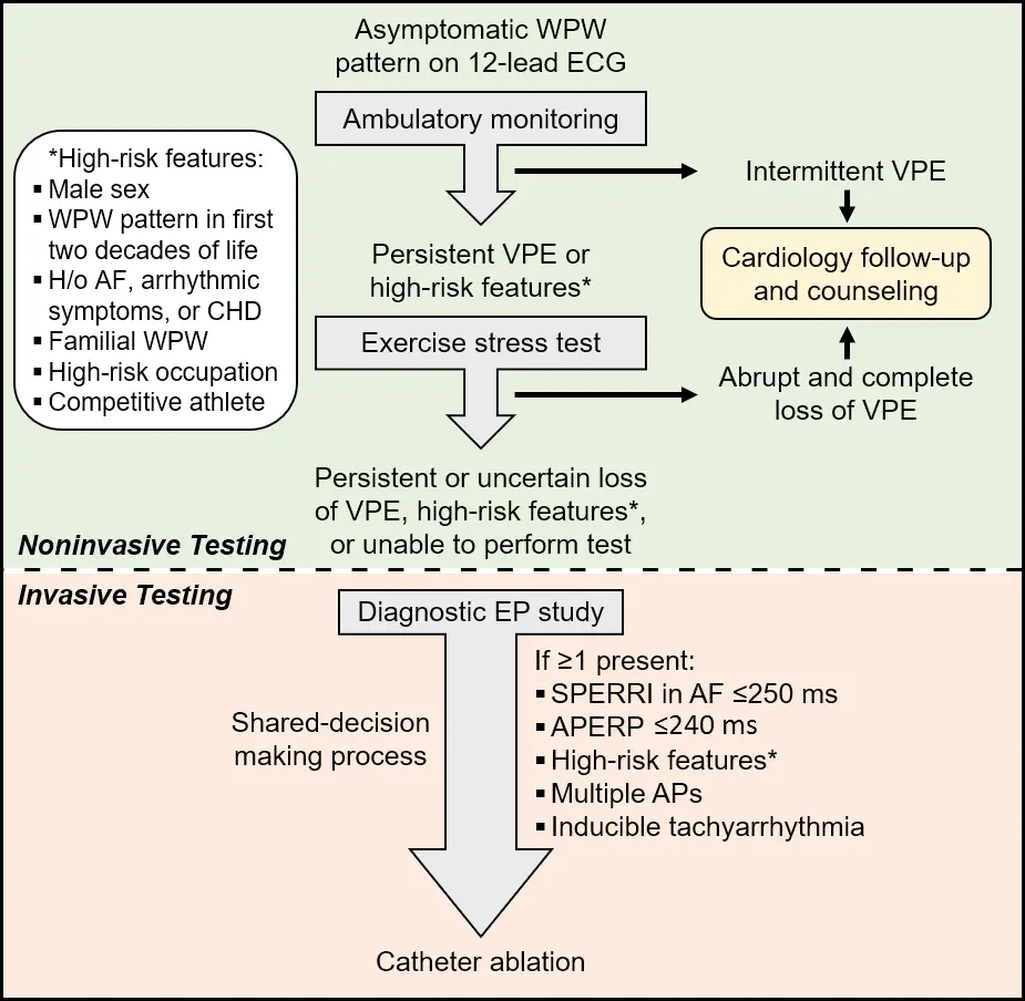 - Noninvasive testing is generally considered safe and should be considered in asymptomatic WPW patients. This includes standard 12-lead ECG, ambulatory monitoring, and exercise stress testing (EST).