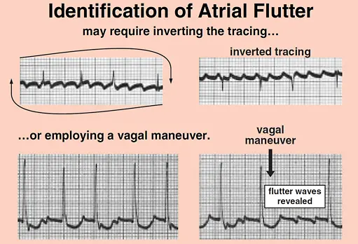 - Inverting a tracing of suspected atrial flutter can help in its identification.