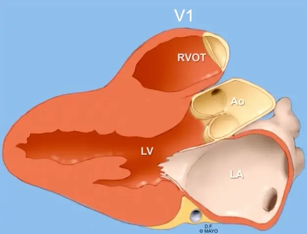 V1 is located anterior to the RVOT as we are accustomed to seeing on PLAX view on Echo