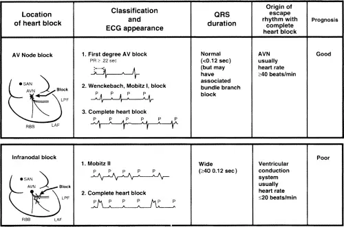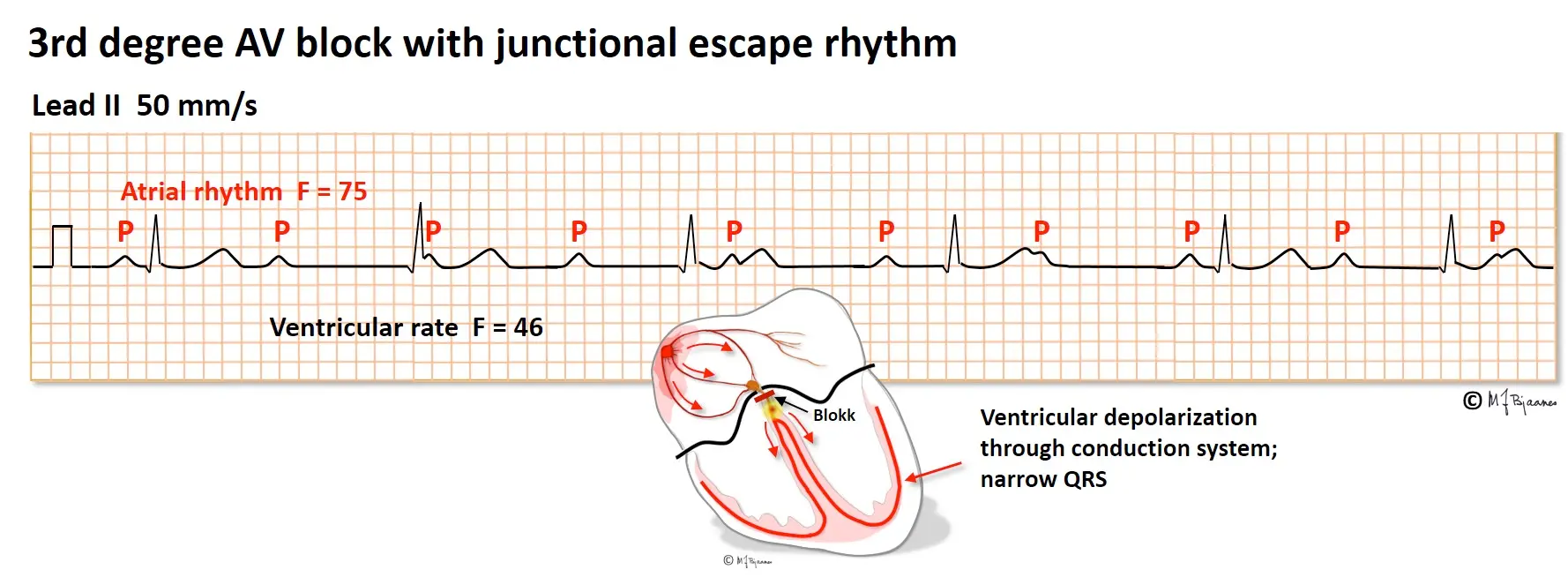 - by contrast, a narrow-complex and more rapid (40-55 bpm) escape rhythm suggests AV nodal block
