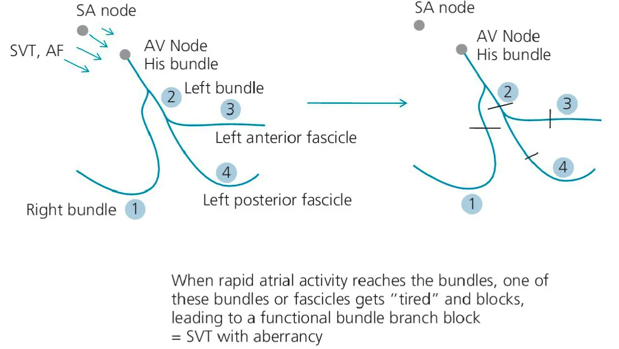 - Supraventricular Tachycardia (SVT) with aberrancy (abnormal intraventricular conduction)