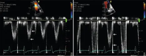 - Caption from Figure 4-6 of Oh Textbook: Examples of LVOT PWD velocity recording in a patient with atrial fibrillation. The sample volume needs to be placed about 5 mm from the aortic annulus to avoid flow acceleration. The spectral broadening (interval between two arrows with turbulent flow) should be less than 40 cm/s (left). The sample volume is too close to the aortic valve or too large in the example shown (right). Of note, there is some variation of LVOT velocity in this example because of atrial fibrillation.