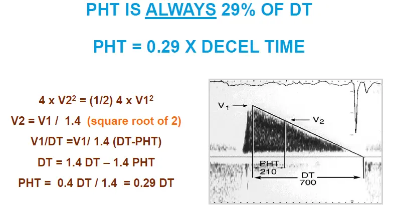 This is based on the observation that PHT is always 29% of your deceleration time (DT). DT is defined as the time from the peak signal of your CWD with a line drawn down your doppler signal until you reach the baseline. In the example from the Mayo Board Review video, DT was 700 msec, ∴ the PHT was 210 msec.