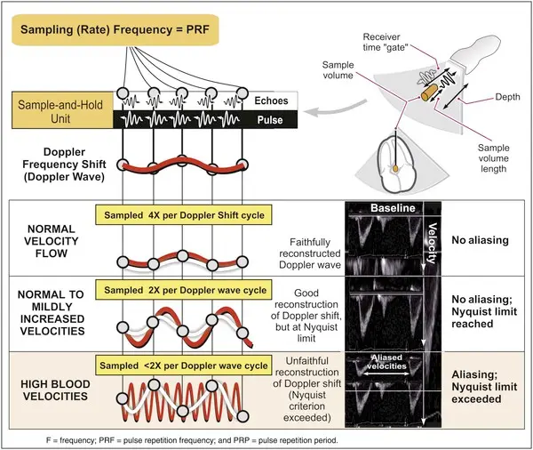- pulsed ultrasound beam emits pulses at a pulse repetition frequency (PRF). If the Doppler frequency > PRF, a Doppler signal is produced that can’t be measured (aliasing). The maximum Doppler frequency that can be identified with pulsed Doppler is known as is the Nyquist limit and is usually around 2 M/s. Continuous Wave Doppler has no Nyquist limit.