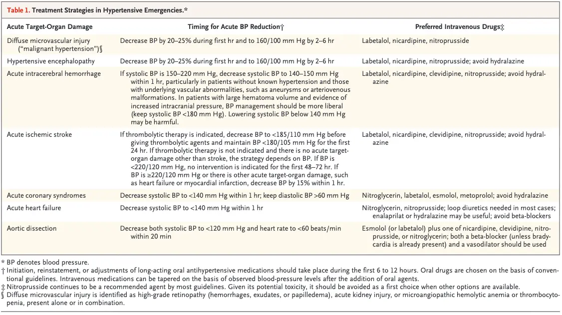 - BP should be decreased by no more than 20 to 25% during the first hour and then to 160/100-110 mmHg during the ensuing 2-6 hoursHypertensive Emergency