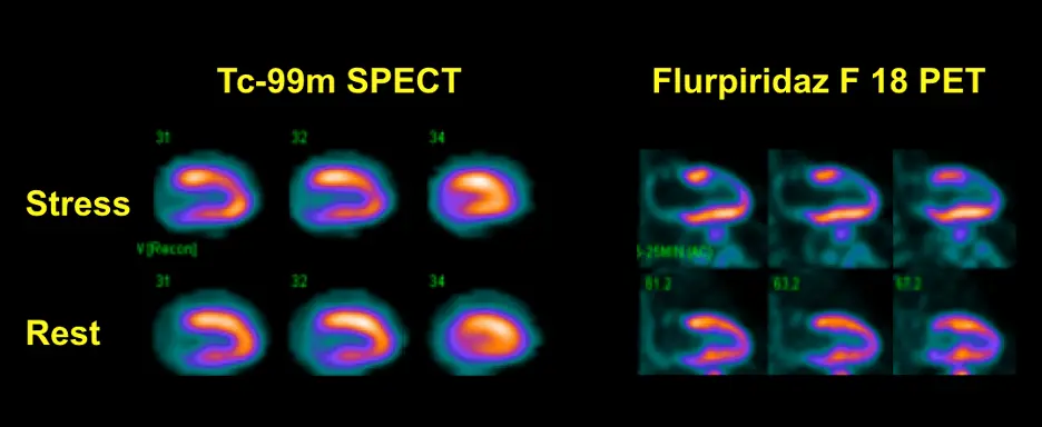 - Example showing superiority of F18 flurpiridaz PET in detecting reversible anterior wall defect that appears much more subtle with SPECT