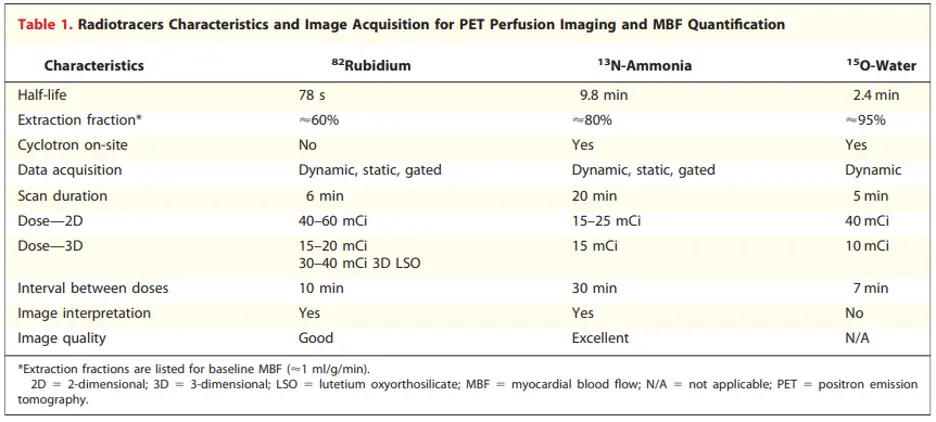At present, 82rubidium chloride (82Rb) and 13N- ammonia (13NH3) are the most commonly used radiotracers for PET MPI and are both FDA-approved. 15O- water is more frequently used in Europe and is not FDA- approved. 13NH3 and 15O- water require an on-site cyclotron due to their short half-lives. 82Rb also has a short half-life and is generator produced.