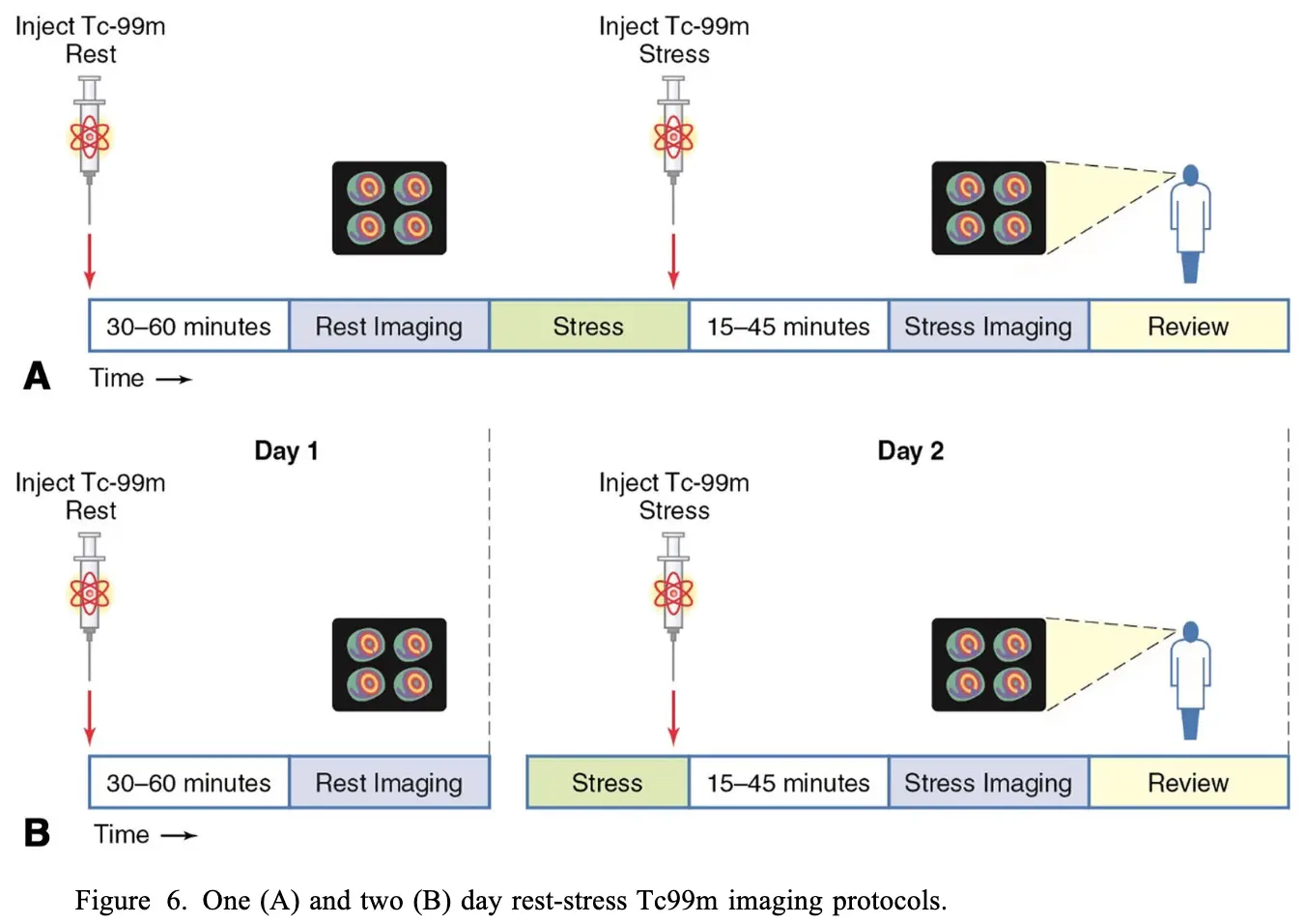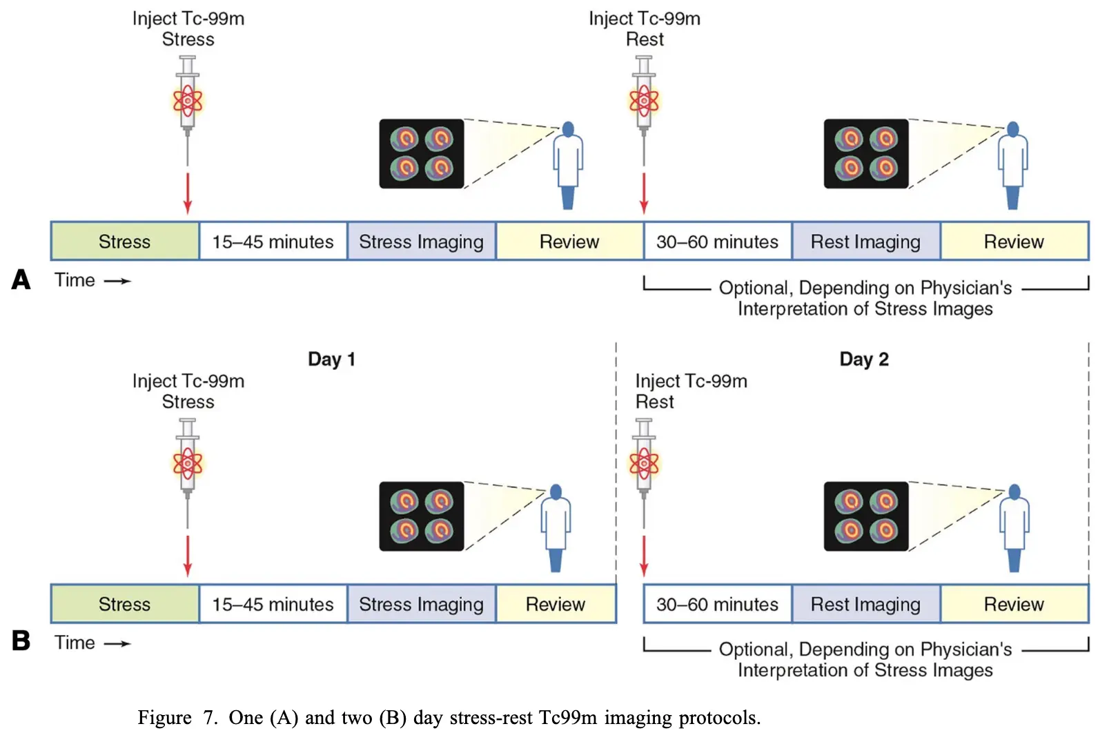 - Advantage of “stress first”/“stress only” protocols is that if the stress images are normal, then rest images may not be needed, i.e. you’re spared the radiotracer injection/dose to the patient.