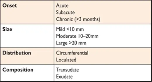 - (Acute/subacute/chronic) (mild/moderate/large) (circumferential/loculated) (transudative/exudative)