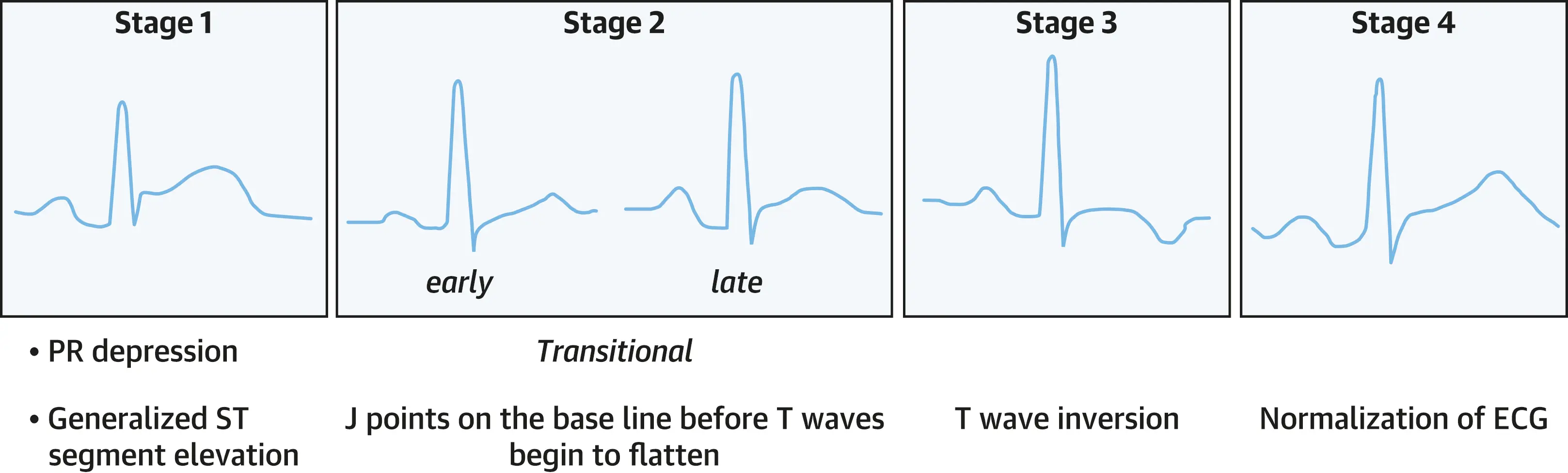 - ECG changes (up to 60% of cases)—with new widespread ST elevation or PR depression in the acute phase