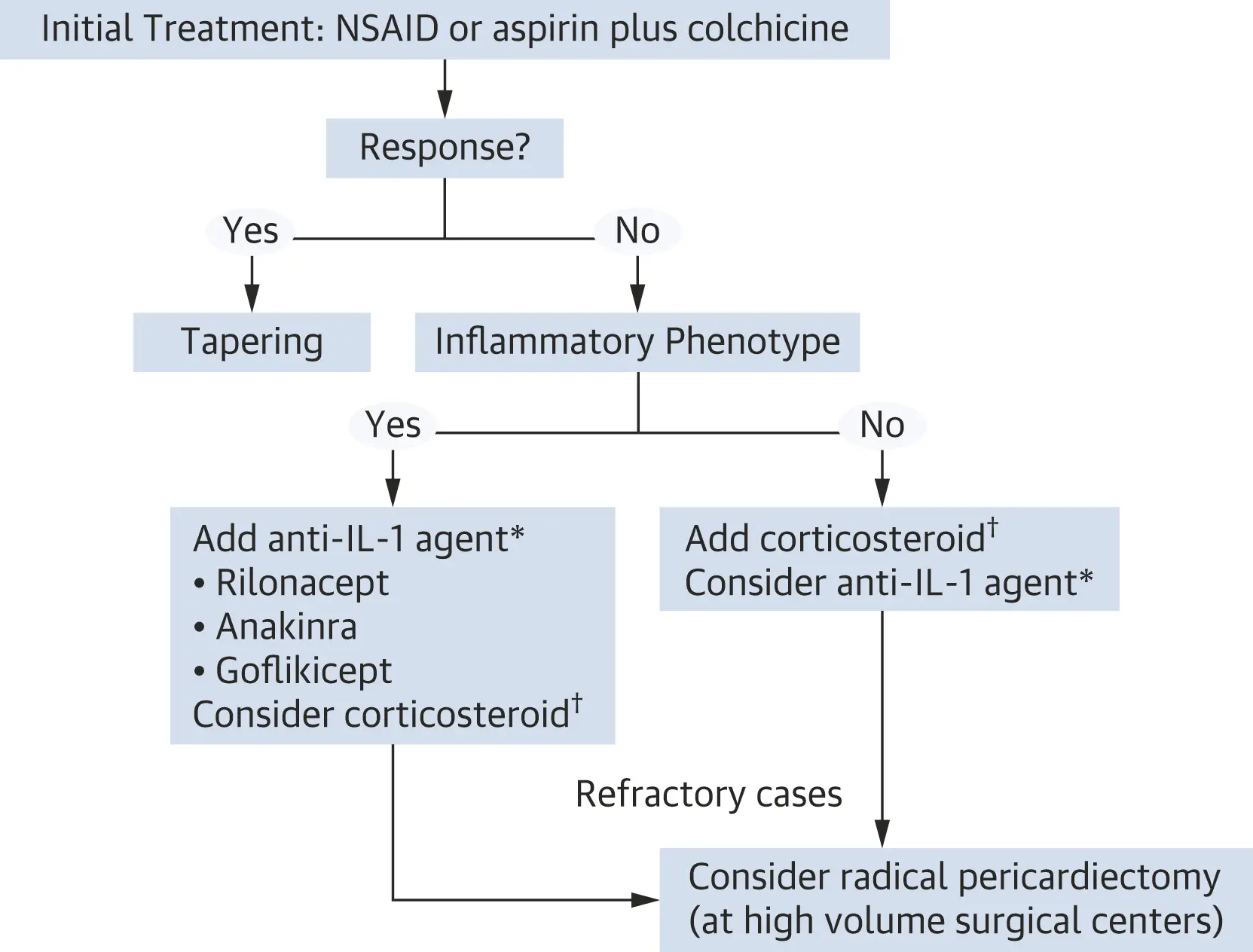 - Aspirin or NSAIDs remain the mainstay of therapy + Colchicine as adjunct