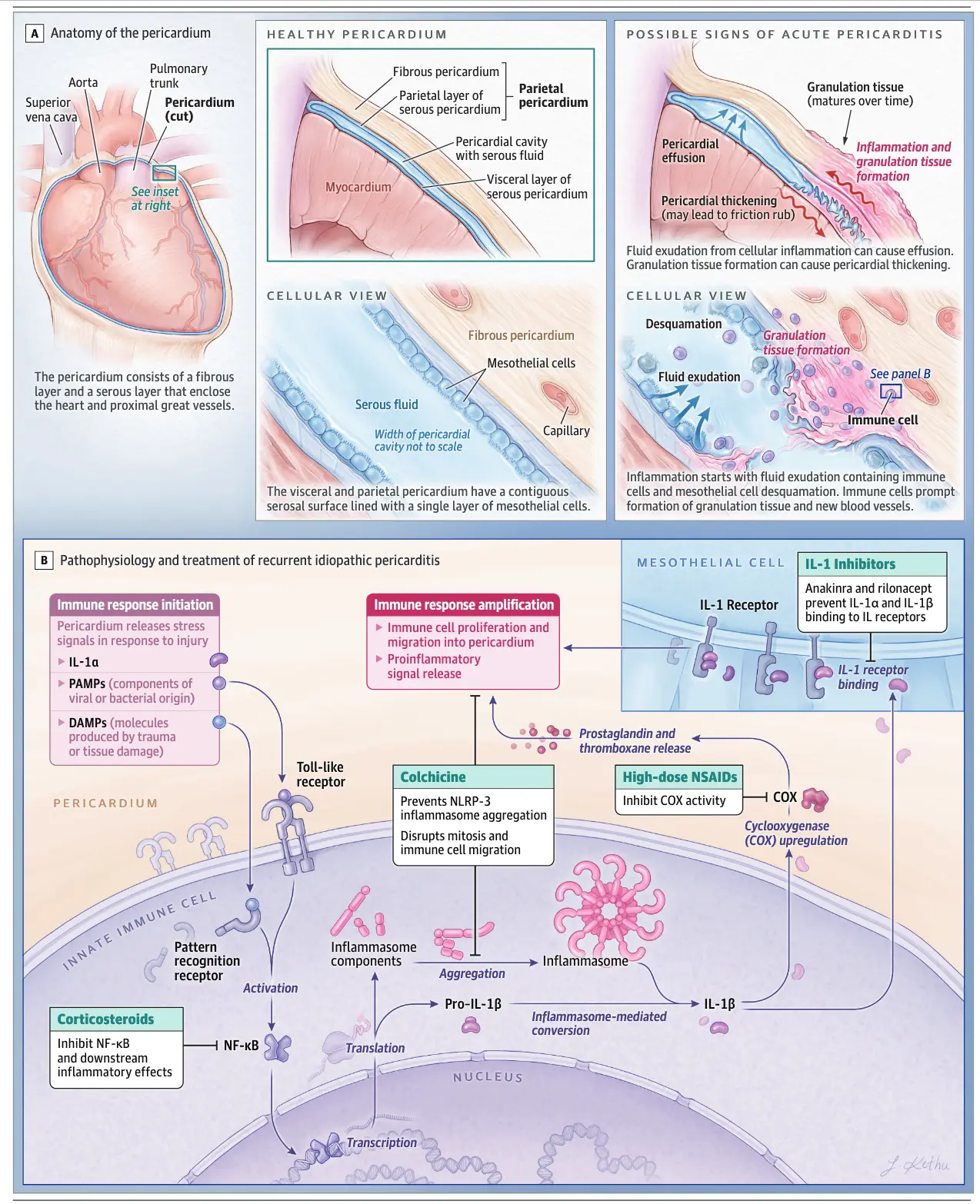 Cremer PC, Klein AL, Imazio M. Diagnosis, Risk Stratification, and Treatment of Pericarditis: A Review. JAMA. 2024;332(13):1090–1100. doi:10.1001/jama.2024.12935 ↩ ↩2 ↩3 ↩4 ↩5 ↩6 ↩7