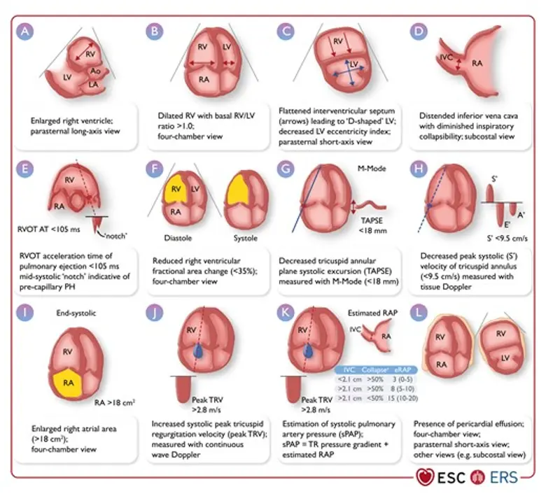 | RV/LV basal diameter/area ratio >1.0 | RVOT AT <105 ms and/or mid-systolic notching | IVC diameter >21 mm with decreased inspiratory collapse (<50% with a sniff or <20% with quiet inspiration) |