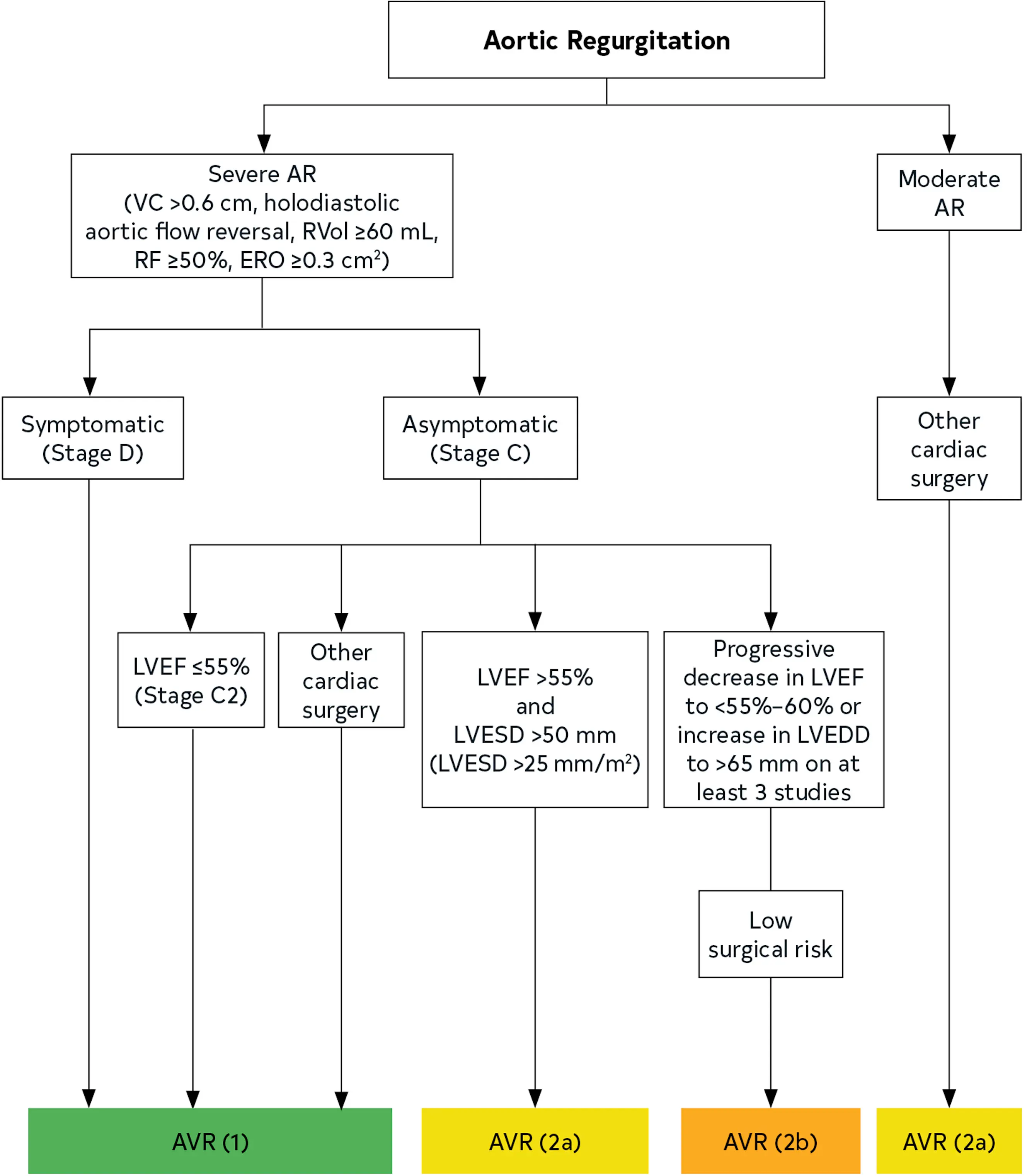 - Moderate AR (Stage B) who is already undergoing cardiac or aortic surgery for other indications, aortic valve surgery is reasonable (Class 2a)