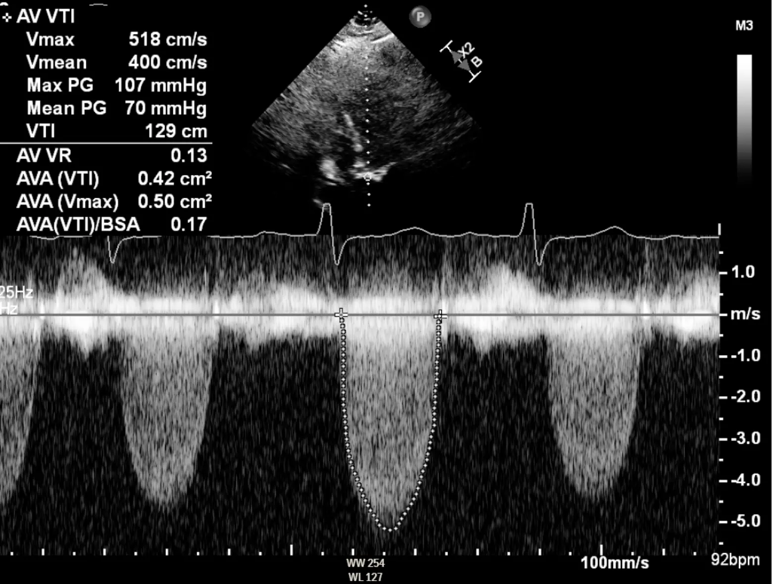 - Peak velocity across aortic valve