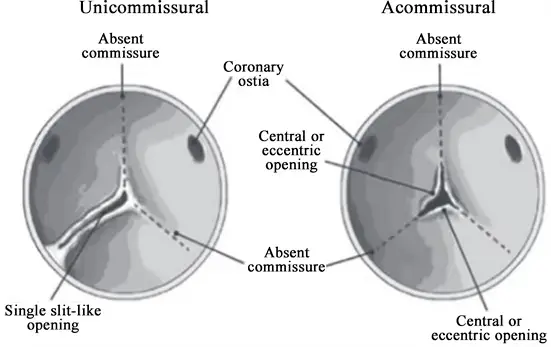 - Uni- or acommissural (a membrane with a hole in it)
