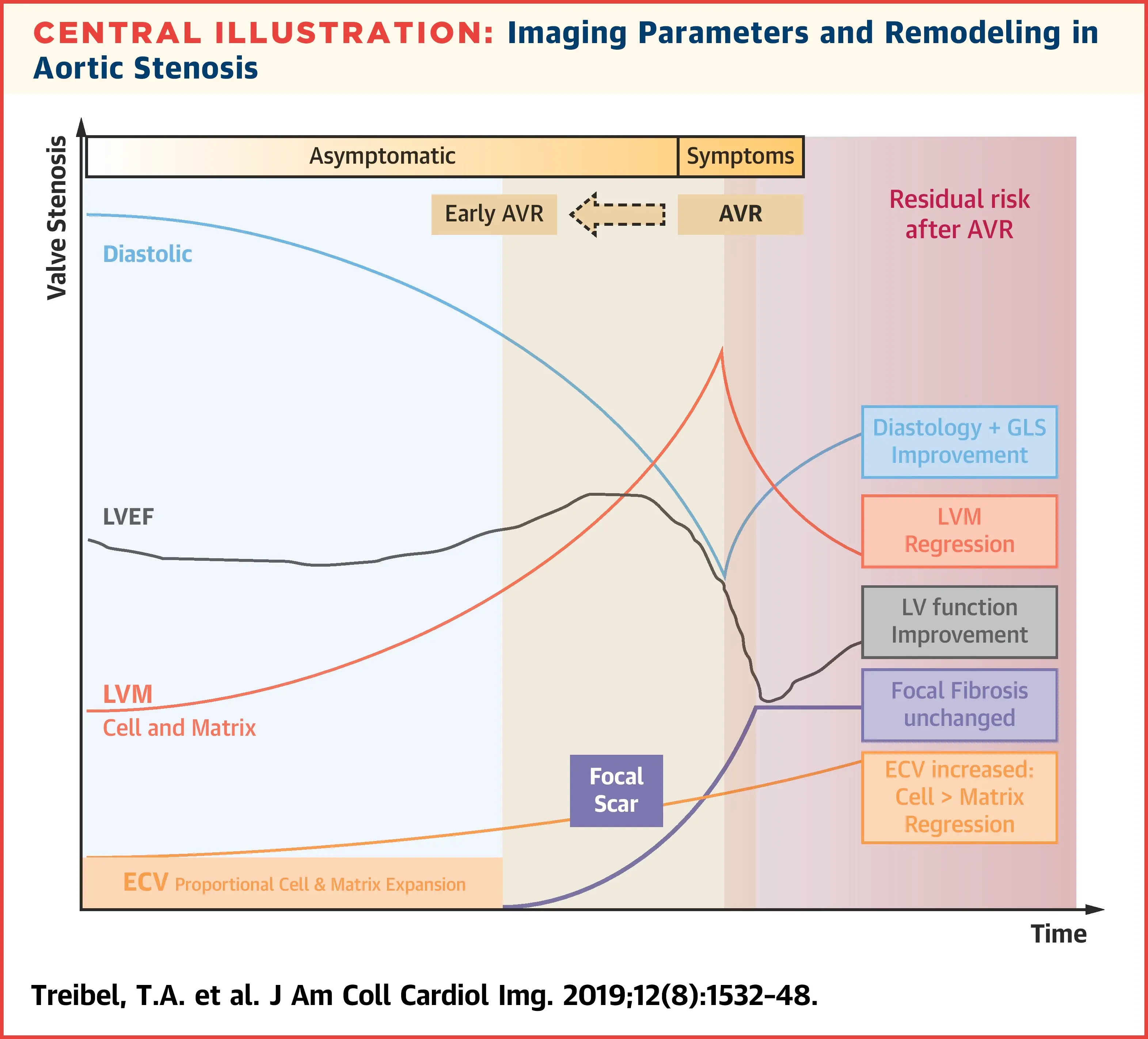 The following figure illustrates the interplay of factors that influence myocardial remodeling in AS. Interestingly, early on you have worsening diastolic function (and global longitudinal strain), ↑ LVH (compensatory ↑ in LV mass), but flat/unchanged LVEF. “Eventually focal, irreversible scars develop which accumulate subendocardially and eventually lead to overt systolic impairment and development of symptoms. Both are Class I indications for aortic valve replacement (AVR). The impetus for finding biomarkers to time earlier AVR is that the presence of irreversible scar results in residual risk of heart failure, arrhythmia and death even after successful AVR.” [^triebel]