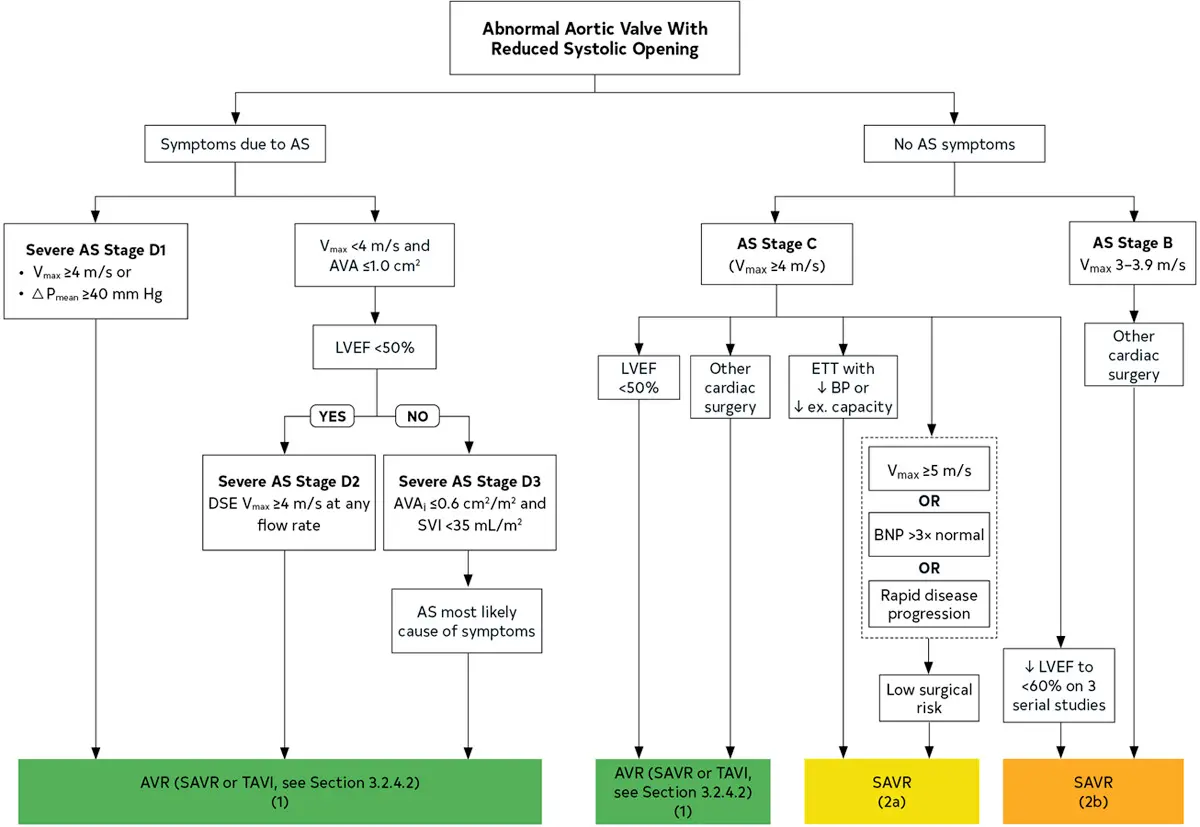 - In patients with Stage D2 (LFLG AS with reduced LVEF), DSE is recommended to determine AS severity and differentiate true- versus pseudo-severe AS
