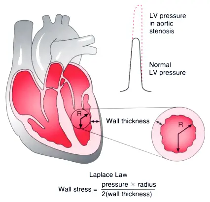 Compensatory concentric LVH that is adaptive to ↑ afterload The increased gradient that is needed with AS as discussed above initially leads to first to adaptive remodeling of the LV as the LV tries to deal with all the stress of this ↑ afterload. Recall that wall stress by the law of Laplace is proportional to the ventricular systolic pressure times the chamber radius, divided by 2 times LV wall thickness.