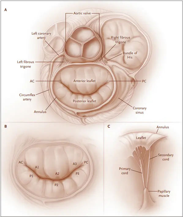 - The mitral valve and subvalvular apparatus include the annulus, valve leaflets, chordae tendineae, papillary muscles, and left ventricular wall.1