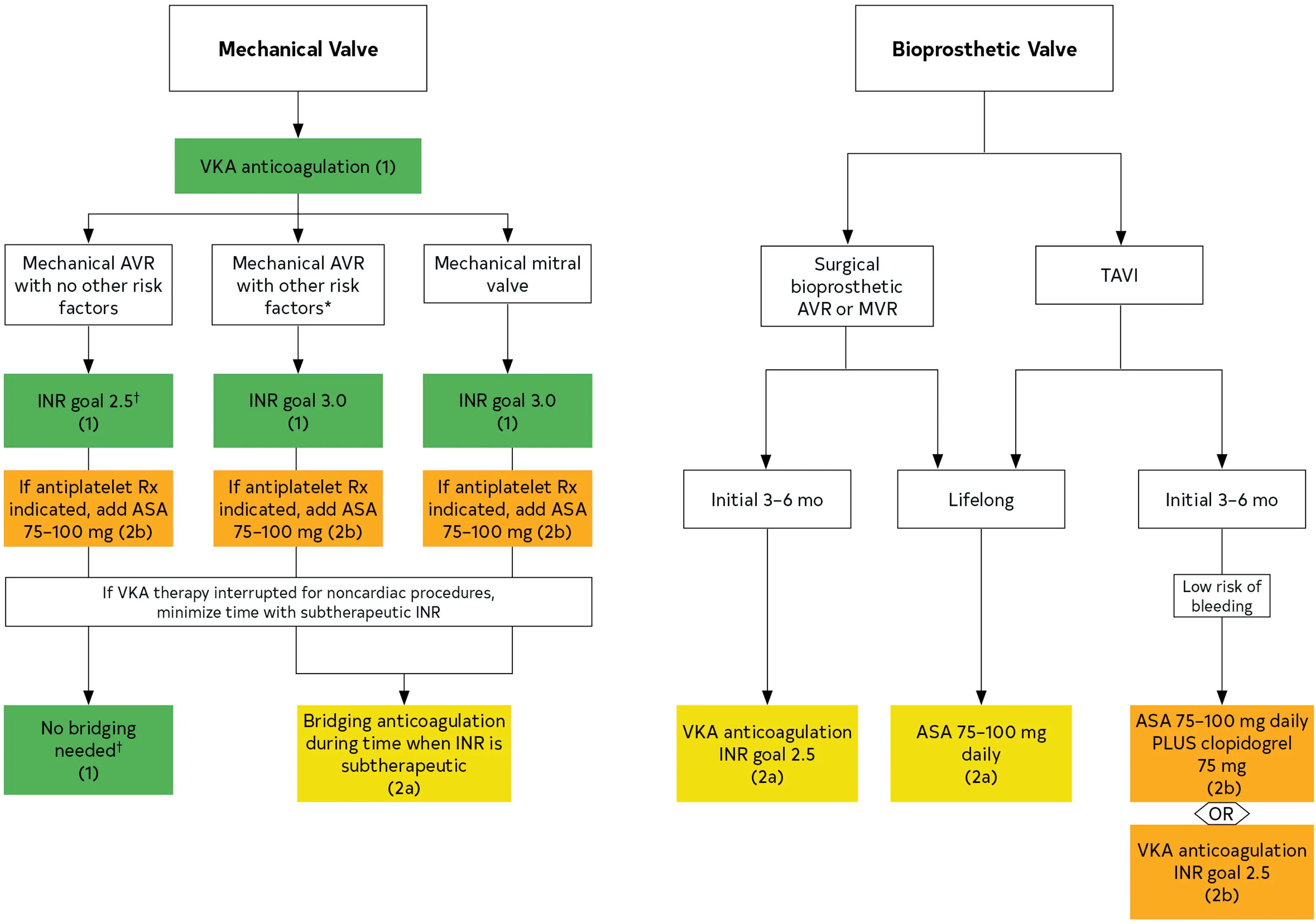 - Target INR of 2.5: aortic MVs in the absence of thromboembolic risk factors (eg, older-generation valves, AFib, previous thromboembolism, hypercoagulable states, and LV systolic dysfunction).