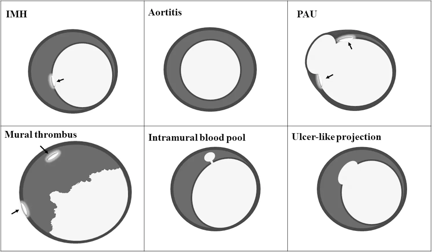 Figure caption: Acute Aortic Syndrome Computed Tomography Differential Diagnosis - Schematic representation of computed tomographic (CT) scans of the aorta of patients with acute aortic syndrome (AAS) and related entities. In intramural hematoma (IMH), calcium is displaced inwards, whereas in a dilated aorta with mural thrombus, calcium is located along the outer aorta border or within the thrombus. Aortic wall thickening is crescentic in IMH, whereas it is usually circumferential in aortitis. Ulcer-like projection (ULPs) have a wide communication with the aortic lumen, whereas intramural blood pools (IBPs) have a tiny communication. Both ULPs and IBPs are found in patients with IMH and are not usually accompanied by calcium deposits. Aortic wall deformation and calcified plaques are typically seen in patients with penetrating aortic ulcers (PAUs). Notice the calcium position (arrows) in each entity.1