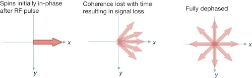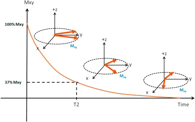 - When the RF excitation pulse is applied, the protons are all spinning in-phase. Immediately after this pulse is applied, they begin to dephase at a rate proportional to the amount of the magnetic field → eventually, protons will return to their out-of-phase initial pre-RF excitation state, as measured by the T2 relaxation time. (Source)
