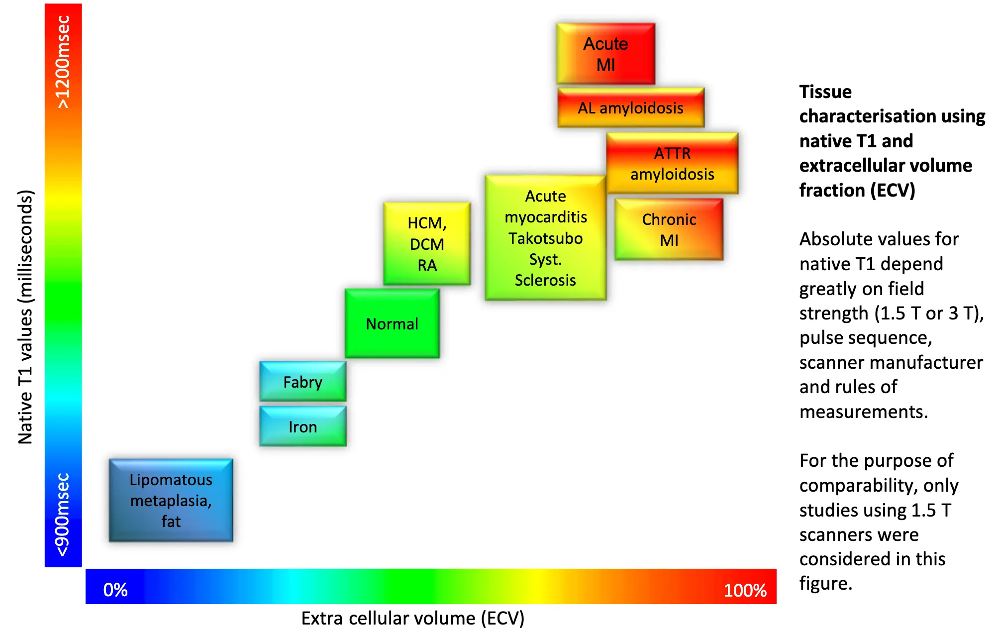- T1, ECV and T2 mapping are typically performed at 1.5 or 3 Tesla (T).