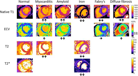 Typical appearance of T1, T2, T2*, and ECV maps in healthy subjects and in patients with myocardial disease. Arrows denote relative change in respective parametric maps.1